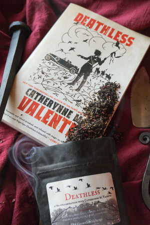Inspired by the harsh landscape of this beautiful retelling, the companion tea blend of Catherynne M. Valente's Deathless is made with an earthy black tea base sweetened with beet that also turns the hue of the brewed blend to a bloody red. Lapsang souchong echoes the war torn landscape of the story and creeping darkness amidst the pages while caraway offers us something of the tastes of Russian black bread and the citrus offers a nod to Russian tea blends. Enjoy alone or sweetened with sugar or honey.